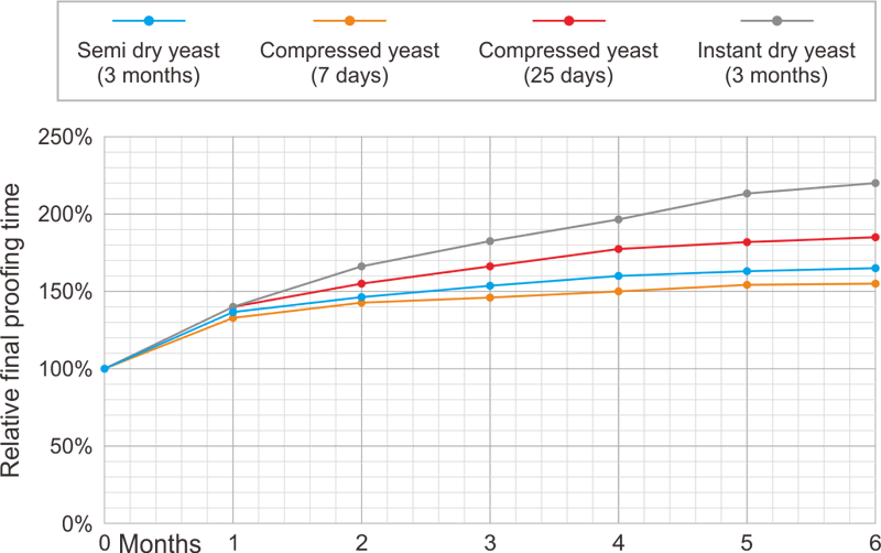 The changes of relative final proofing time of frozen dough produced by different yeast over storage time