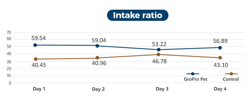 O GroPro Pet pode melhorar significativamente a palatabilidade dos alimentos para gatos através do seu sabor único. A adição de 20 kg de PB100 por tonelada de ração para gatos pode aumentar a ingestão de ração em aproximadamente 5g por refeição e melhorar as taxas de ingestão em 15-20%.