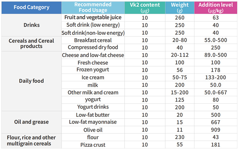 A Comissão Nacional de Saúde e Planejamento Familiar da China aprovou a fortificação da vitamina K2 no leite em pó preparado para crianças e mulheres grávidas, o que pode evitar sintomas hemorrágicos causados pelo desenvolvimento incompleto do sistema de coagulação ou deficiência de vitamina K causada pela deficiência alimentar em crianças e recém-nascidos.