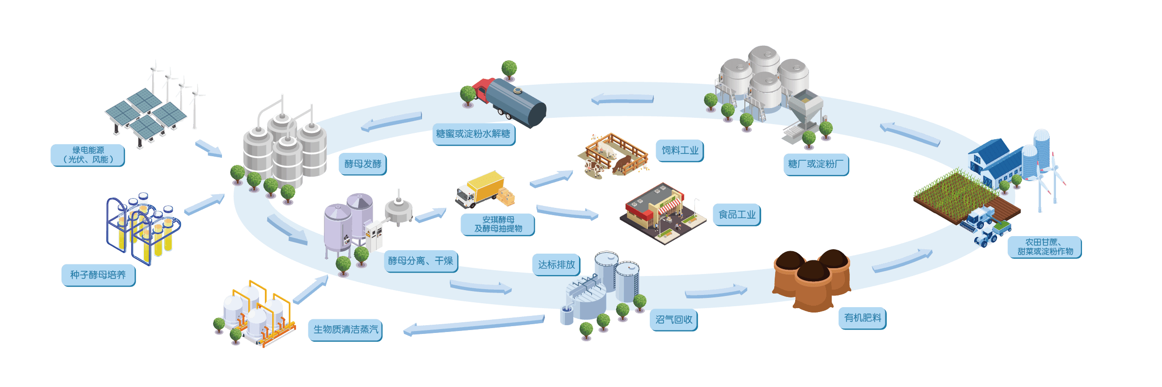 公司主要以糖厂副产物糖蜜以及水解糖等为原料,生产高附加值的活性干酵母及其衍生物,延长产业链条,形成了糖蜜-酵母原料-酵母-酵母营养液-肥料-土地-农作物的资源循环产业链,实现了良好的经济效益、环境效益和社会效益。